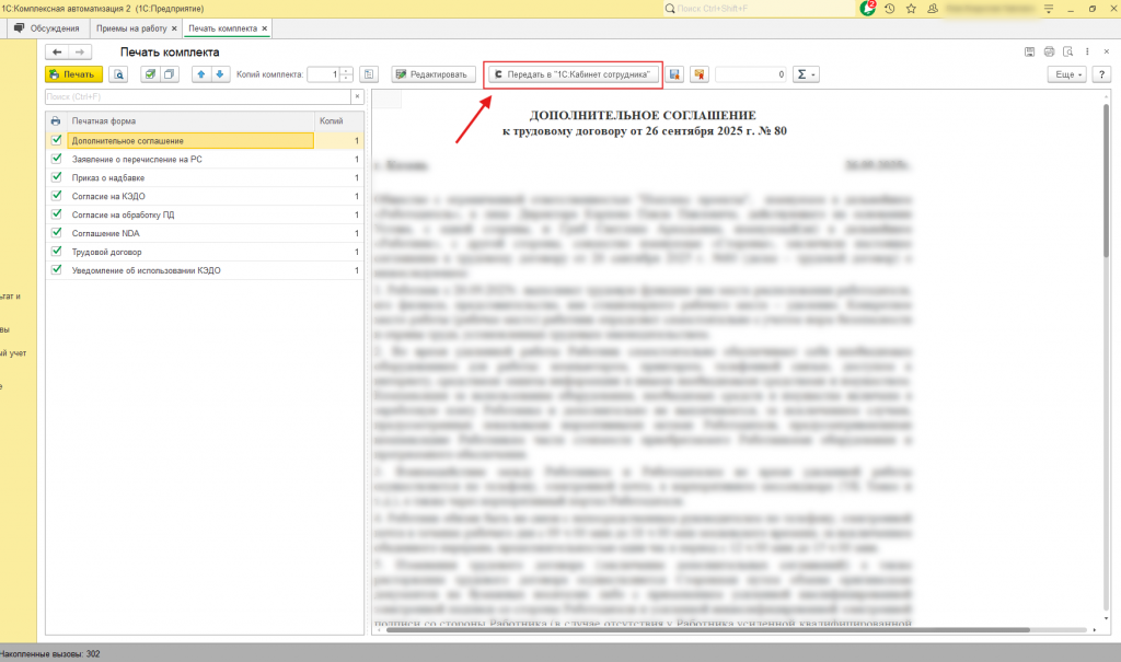 Реализует функцию "Передать в 1С:Кабинет сотрудника" для отправки документов на подпись.