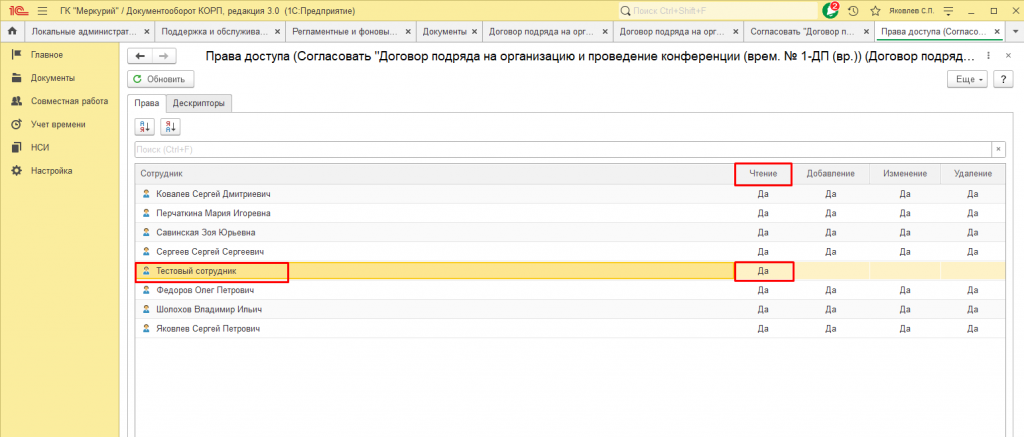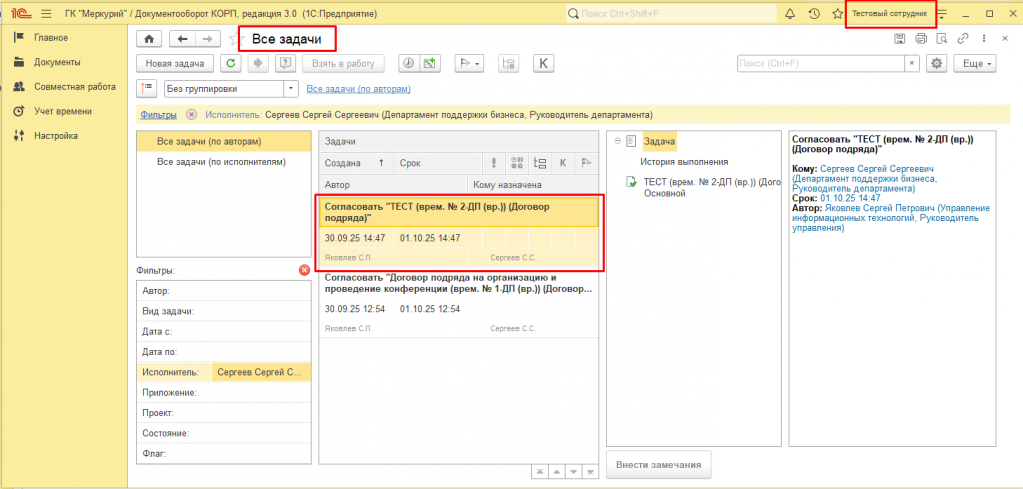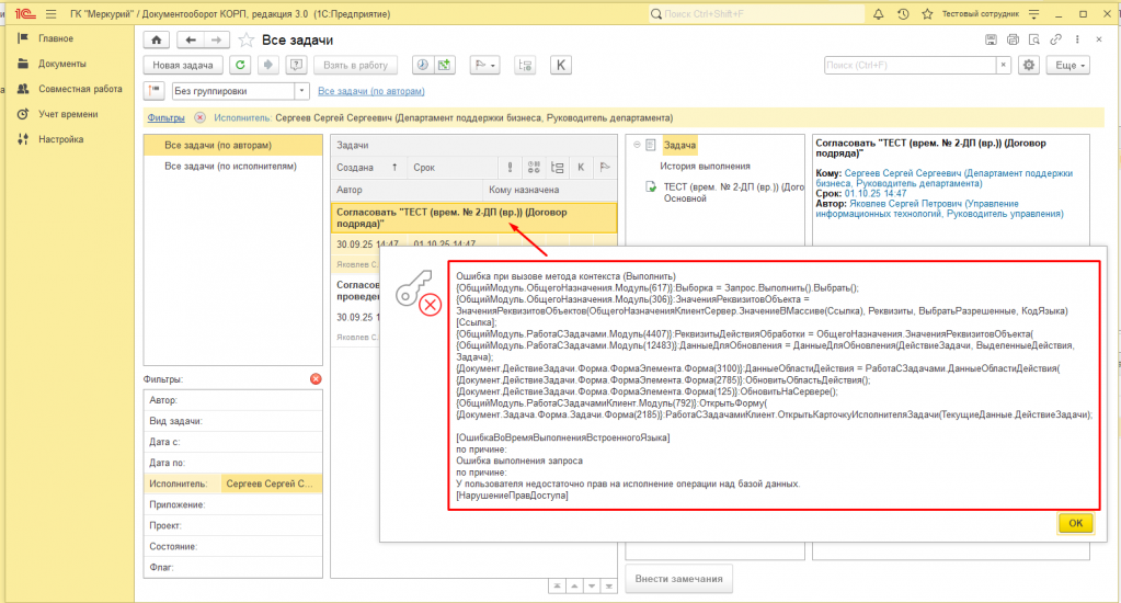 1. После пересчета прав у Тестового сотрудника появляется доступ к задаче.