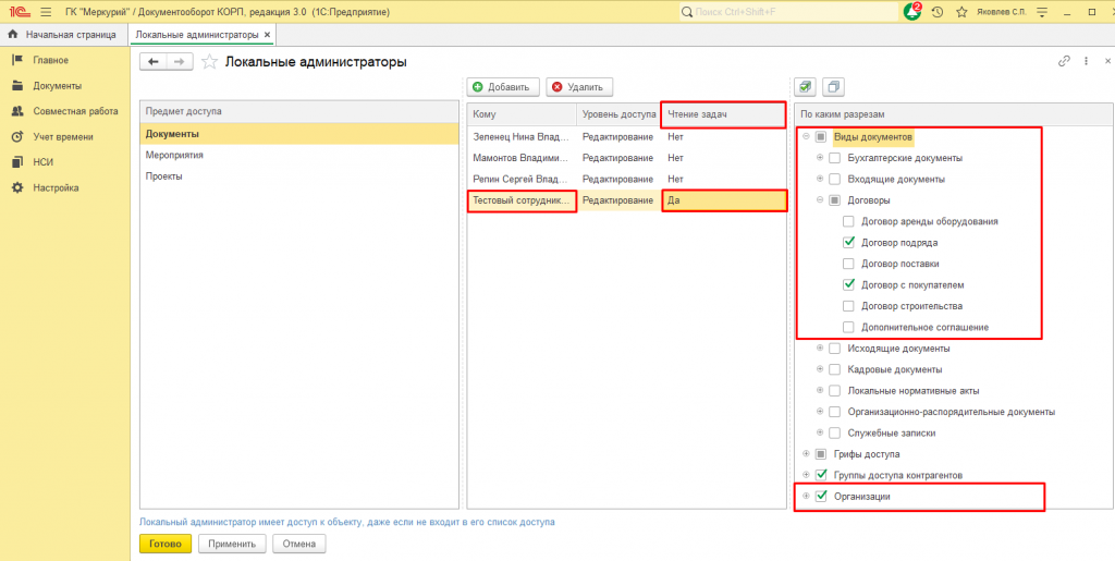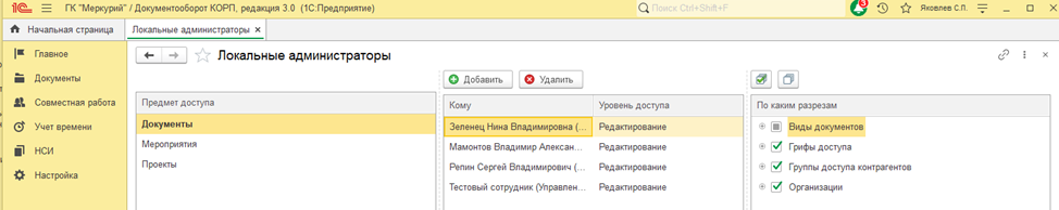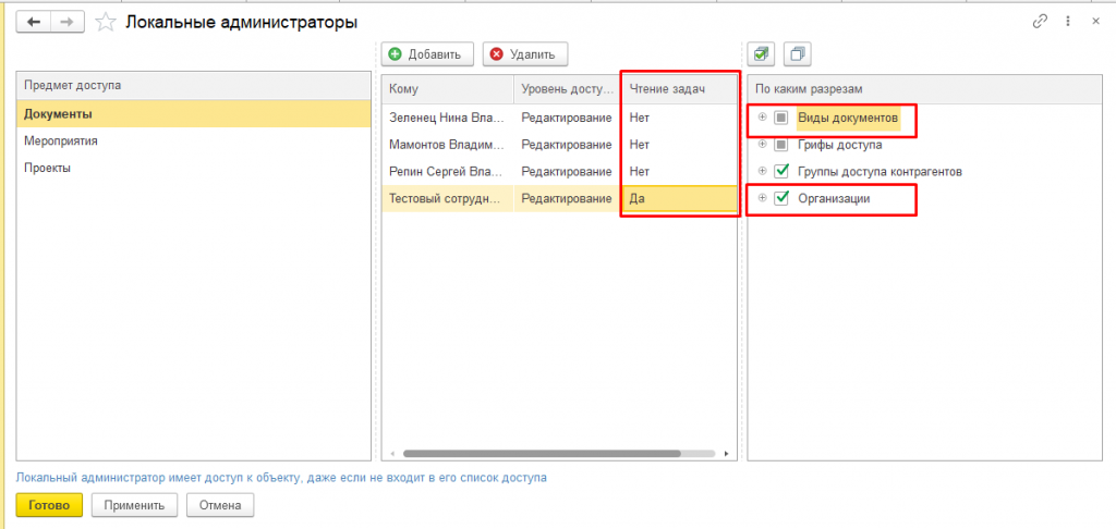 Также есть функционал «Локальные администраторы», расширяющий доступ к документам, но не к задачам.