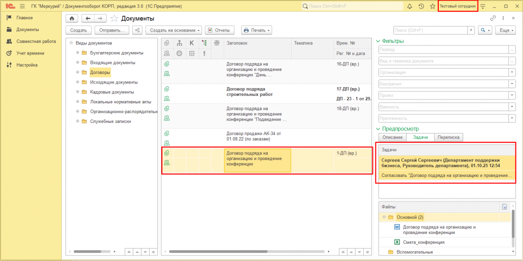 Пользователю Тестовый сотрудник нужны права на чтение задач по Договорам подряда по всем Организациям.