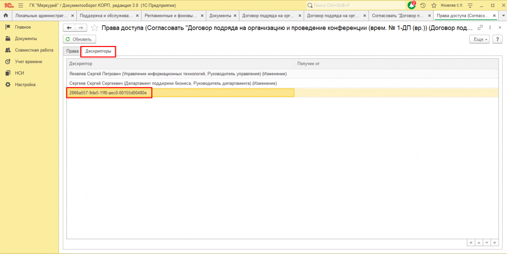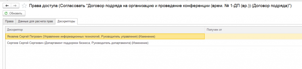 1. После сохранения настройки, формируются дескрипторы доступа объектов локальных администраторов с идентификаторами: Задача, Действие задачи и видом объекта Вид документа, Организация.
