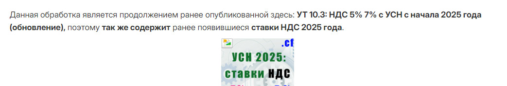 Данная обработка является продолжением ранее опубликованной здесь: УТ 10.3: НДС 5% 7% с УСН с начала 2025 года (обновление), поэтому так же содержит ранее появившиеся ставки НДС 2025 года.