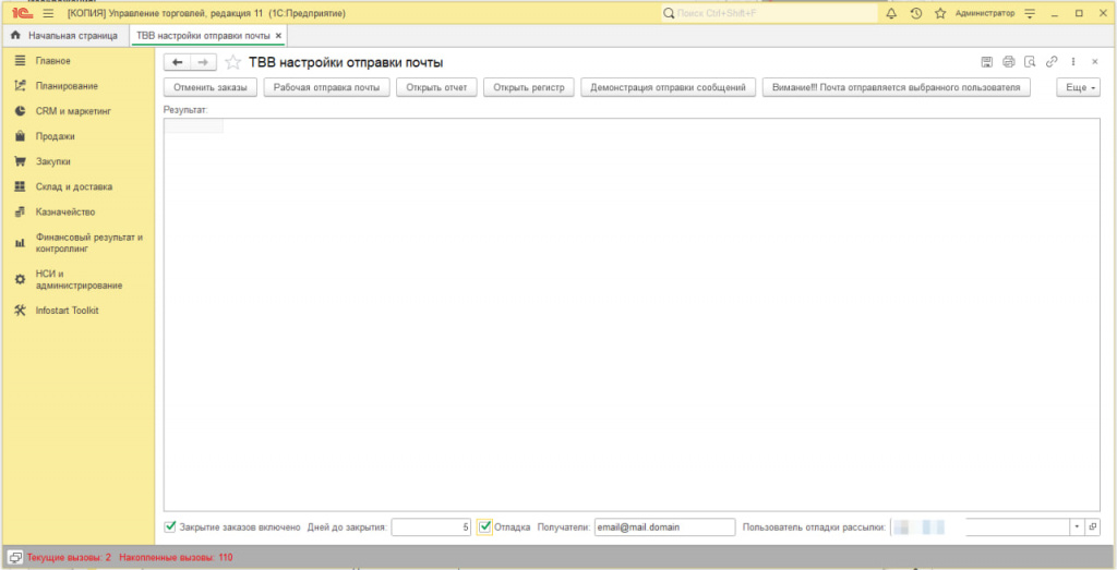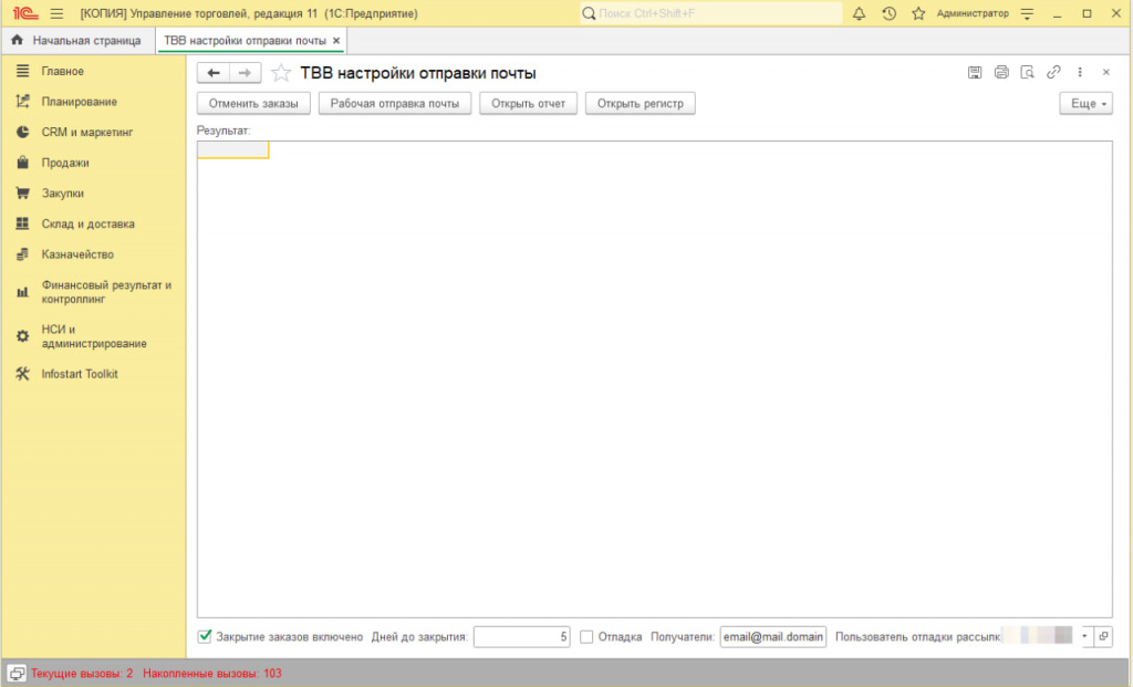 3. Отправлять на электронную почту отчет ответственному о закрытых заказах (адрес хранится в справочнике Пользователи) и на неограниченное количество произвольных электронных адресов, разделенных точкой с запятой - ";"