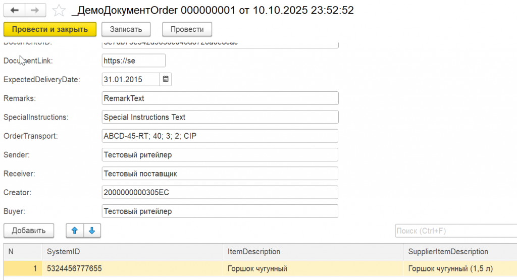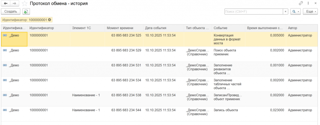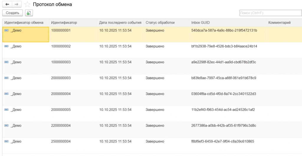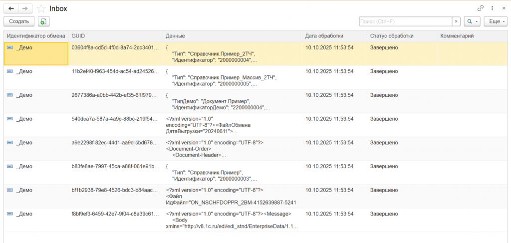 • Сохранение входящих данных в регистре сведений Inbox (реализация паттерна Inbox).