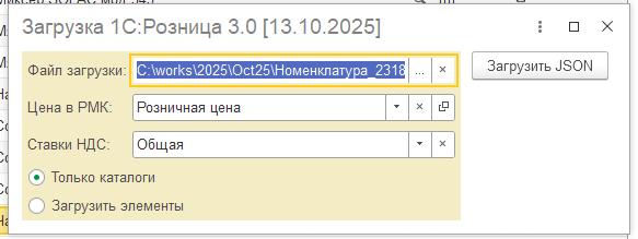 Далее, полученный zip-архив открываем в обработке для "новой" программы и нажимаем "Загрузить JSON".