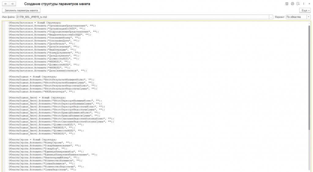 В результате будет автоматически сгенерирован текст кода в виде структуры параметров по всем областям макета табличного документа.