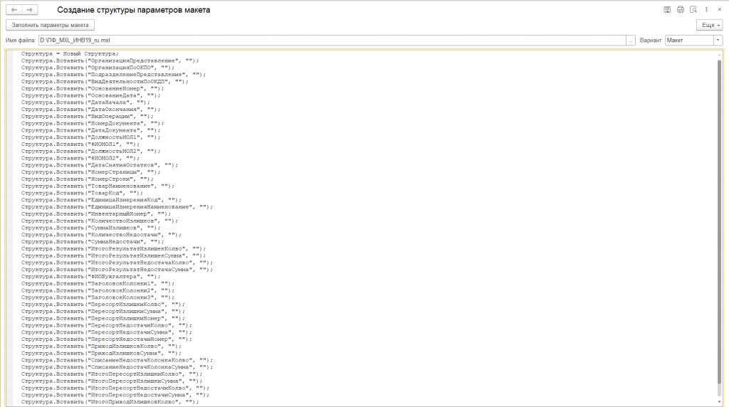 Обработка дает возможность выбрать файл макета в формате "mxl", указать вариант заполнения структуры, после сгенерировать текст кода в виде структуры параметров.