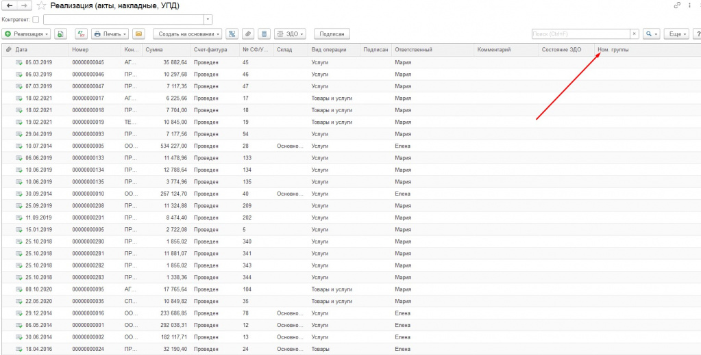 Расширение позволяет вывести в список реализаций номенклатурные группы по всем отраженным в документах товарам/услугам. Значения номенклатурных групп в списке появляются после перепроведения документов.