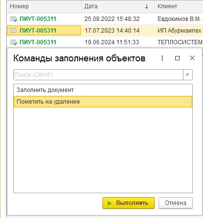 В списке документов выделяем те документы которые хотим пометить на удаление, а затем запускаем обработку нажатием кнопок как показано на изображении ниже: