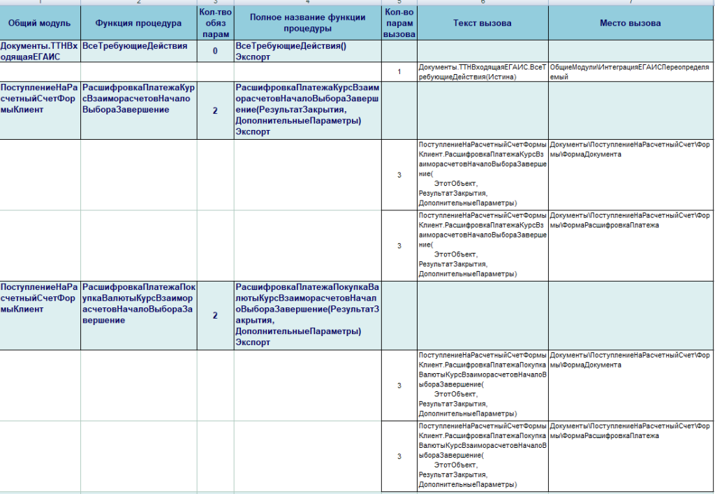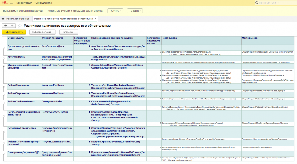Удобной особенностью является вывод в отчете всех мест вызова функций/процедур, т.е. потенциальные ошибки даже не нужно искать глобальным поиском по конфигурациям, всё выводится в отчете. Так же выводятся все ключевые поля для визуального контроля, в данном случае это количество обязательных параметров и количество параметров вызов.