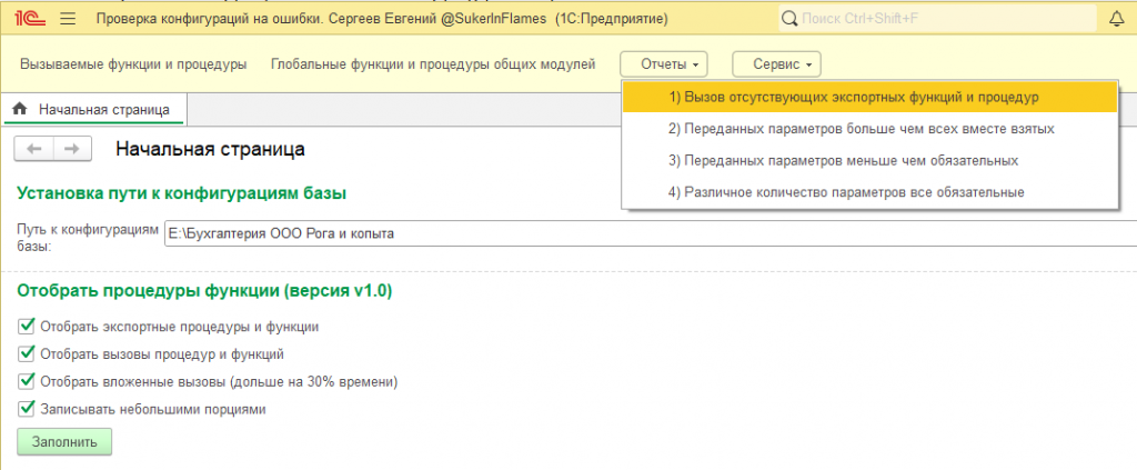 1) Отчет «Отсутствующие экспортные процедуры и функции» т.е. в программном модуле есть вызов, а в общем модуле / модуле менеджера нет такой процедуры или функции по разным причинам: перенесли в другой модуль, закомментировали, переименовали, убрали Экспорт, неудачно обновили (^_^) и т.п.