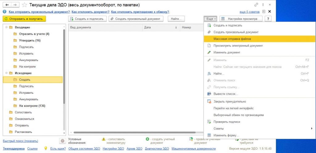 В рабочем месте есть возможность массовой рассылки документов по ЭДО.