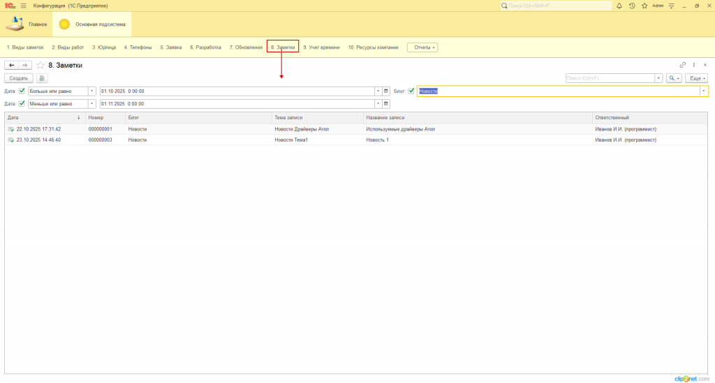 7. Документ заметки - предназначен для заметок различных групп. Связан со справочником Виды заметок