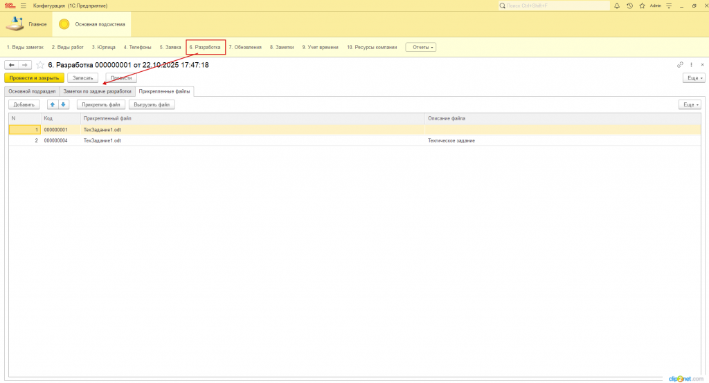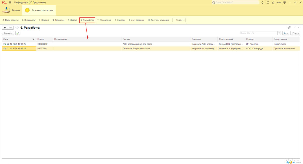 5. Документ Разработка - предназначен для записи информации о задачах разработки