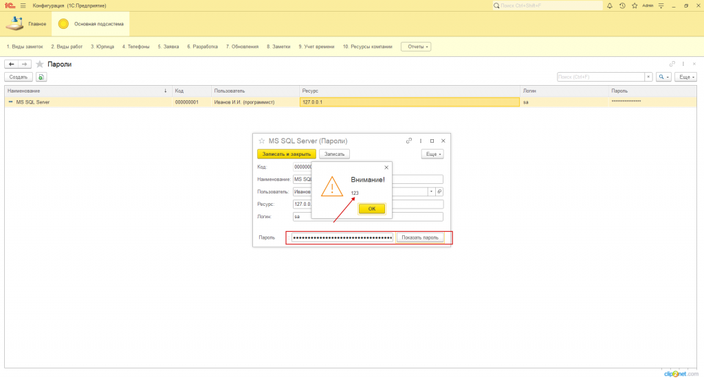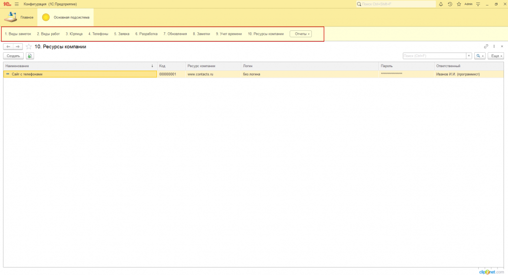 10. Добавлен справочник «Ресурсы компании», где можно хранить данные обо всех ресурсах компании, которые программист может не помнить