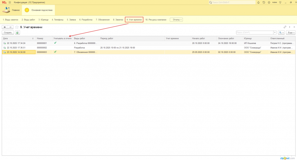 8. Документ Учет времени - предназначен для неформализованного учета времени - такого, какой принят в каждой организации. Связан со справочником Виды работ.