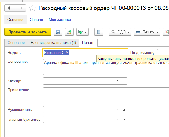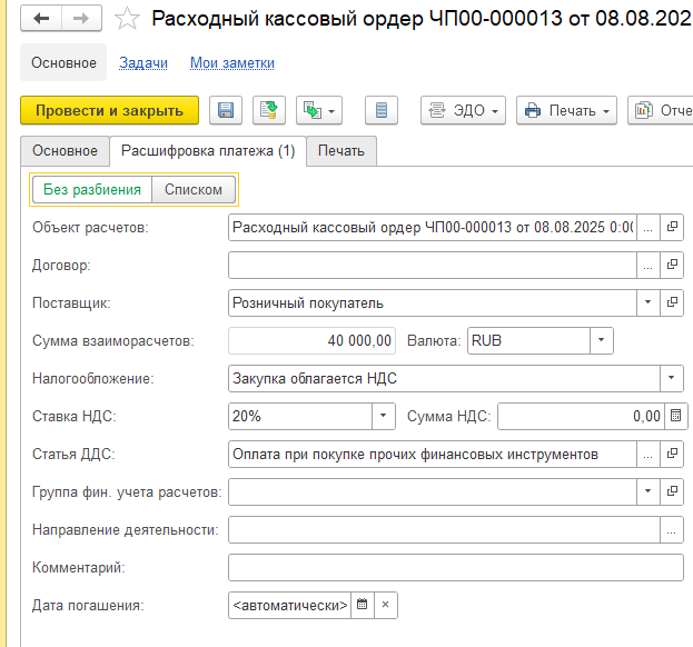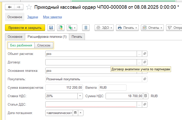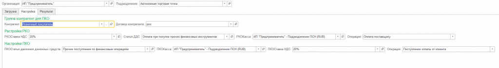Задаются значения одного Контрагента для всех ПКО и реквизиты ПКО. Для РКО задаются реквизиты документа, а контрагент будет подставлен из значения табличной части Контрагент1с