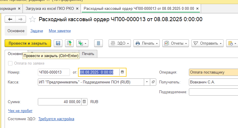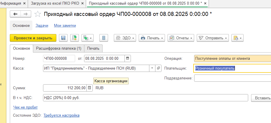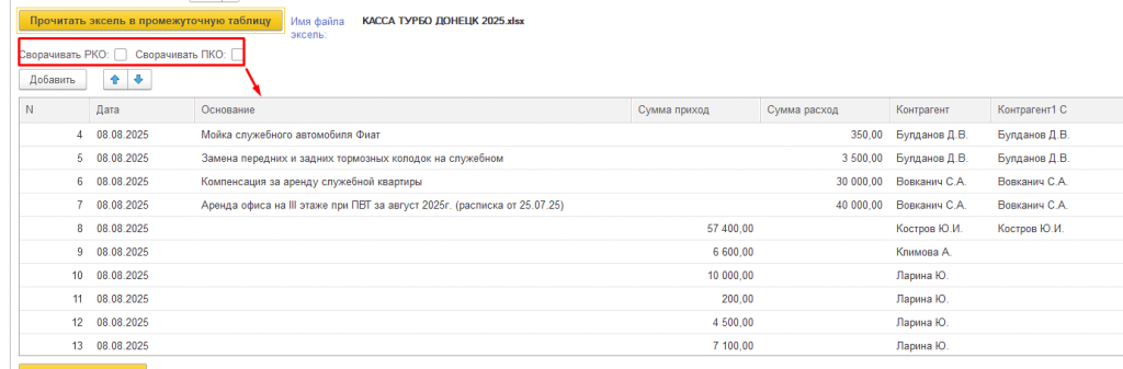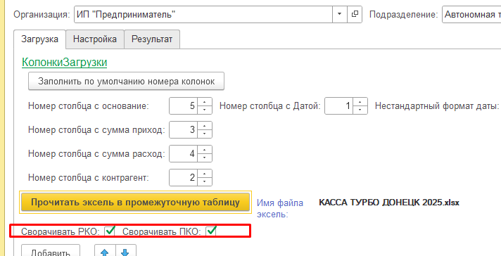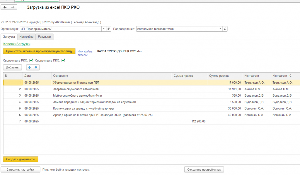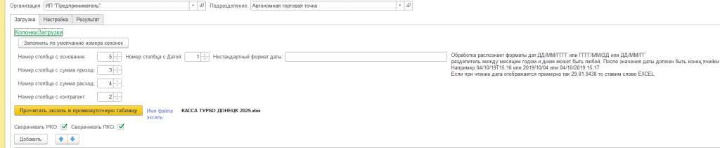 Контрагент1с заполняется при загрузке Excel файла. Поиск происходит по наименованию контрагента. Если контрагент найден, то заполнит значение Контрагент1с. Если Контрагент1с пустой, то при создании документов ПКО и РКО создаст контрагента и партнера (физические лица)