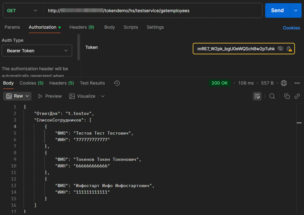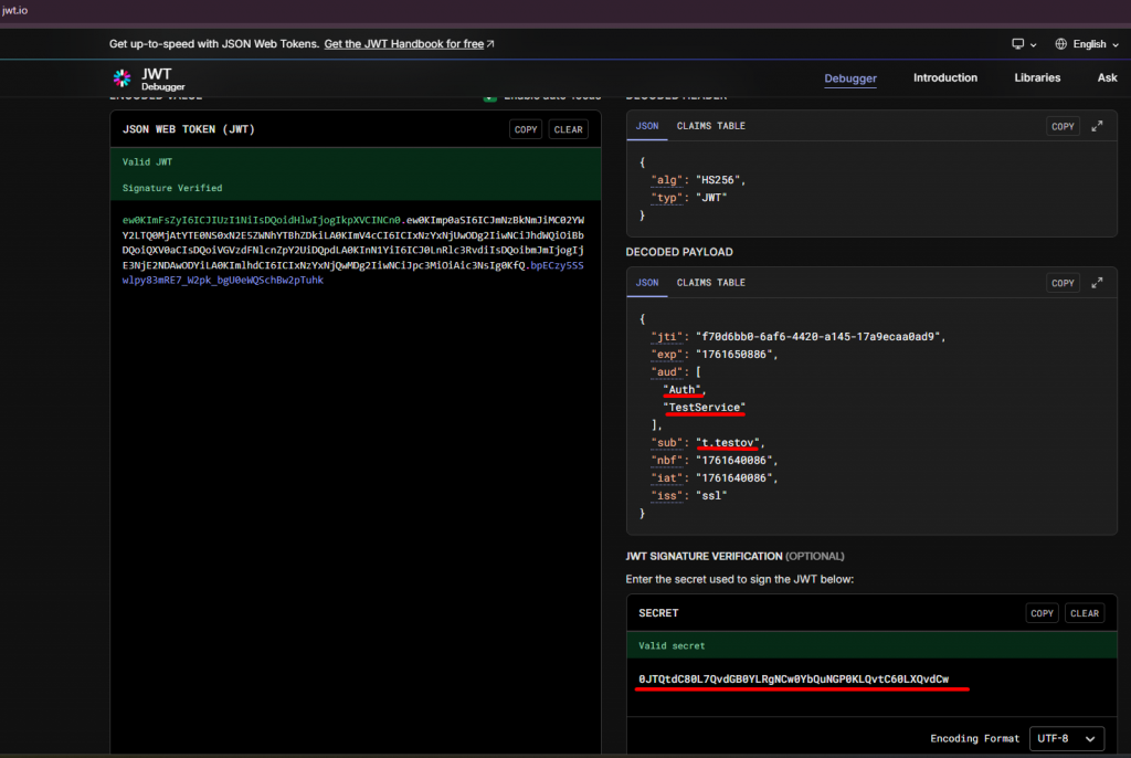 2. TestService - сервис с единственным методом, который возвращает данные, запрошенные с использованием корректного JWT-токена (проверка авторизованного доступа). Дополнительно добавил определение текущего пользователя по токену.