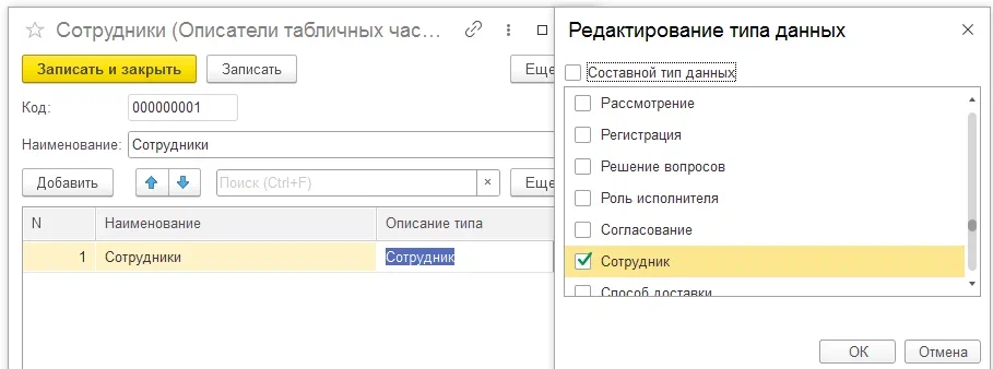Реквизит представляет собой ссылку на справочник «Описатели табличных частей», в котором определяется необходимый состав колонок табличной части и их типы: