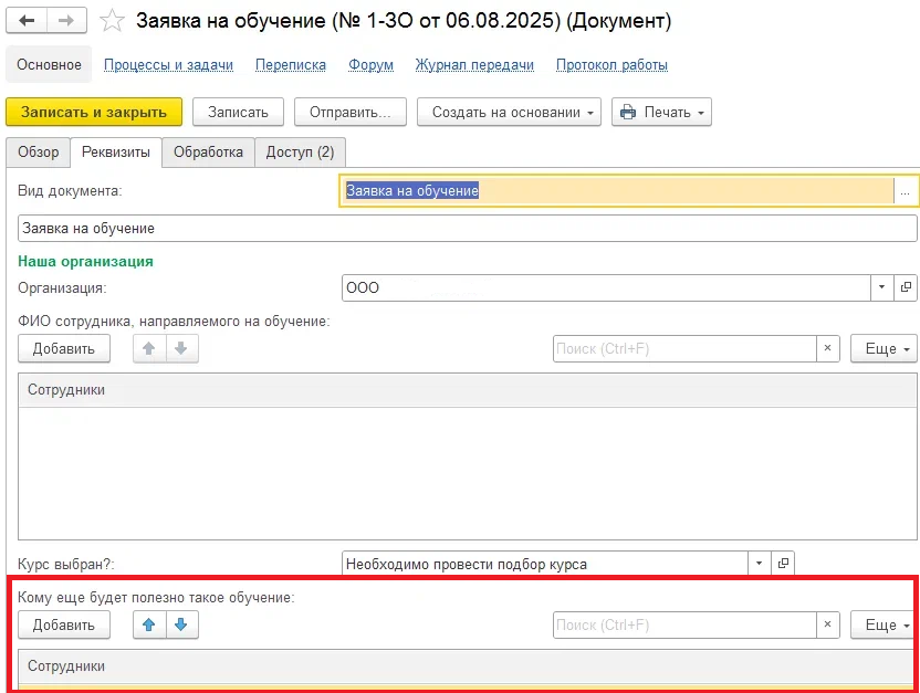 Представленное в публикации решение было разработано в рамках небольшой задачи - на форму документа "Заявка на обучение" системы Документооборот требовалось добавить дополнительную табличную часть со списком сотрудников, которым заявленный тренинг также может быть полезен: