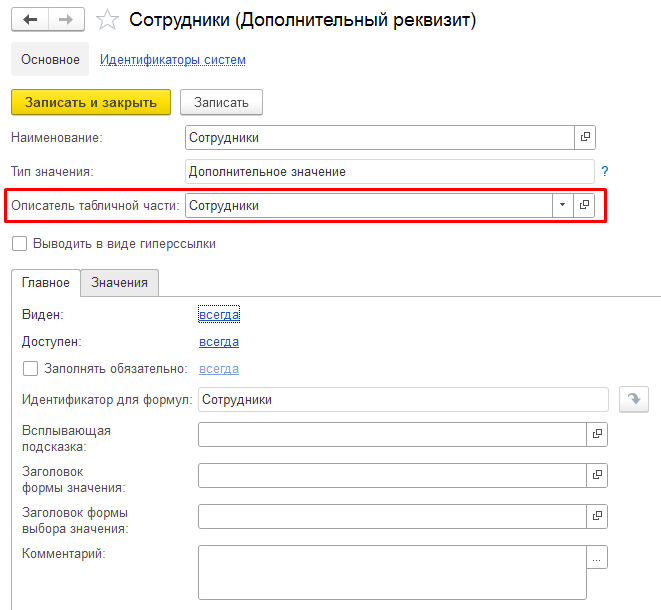 По завершении подключения расширения потребуется перезапуск 1С:Предприятия. После успешного подключения расширения на форме элемента ПВХ "ДополнительныеРеквизитыИСведения" должен появиться реквизит "Описатель табличной части":