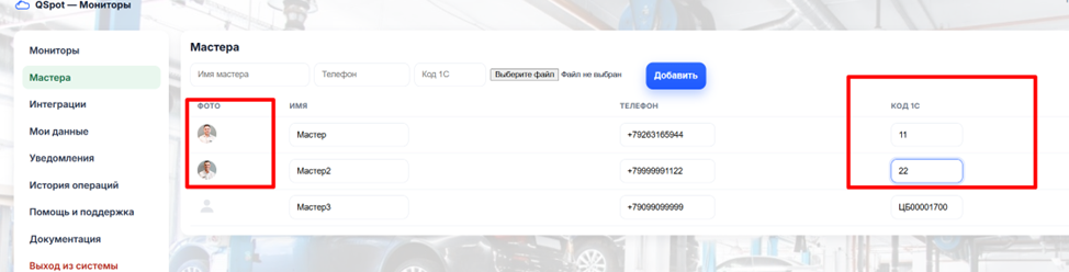 На вкладке «Мастера» добавляем список мастеров и указываем их рабочие телефоны. Загружаем фотографии и связываем данные с 1С по коду 1С.
