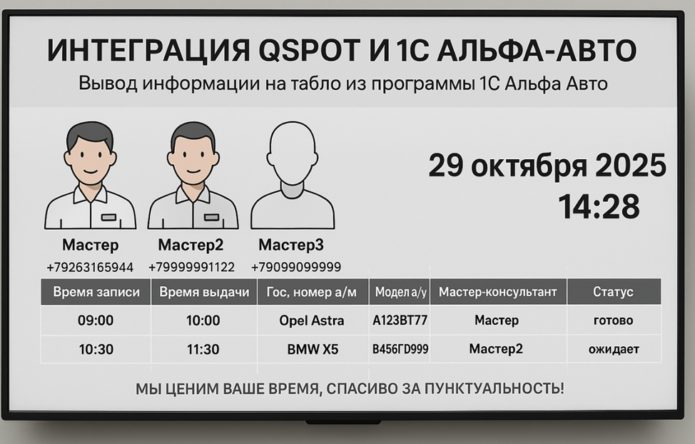 💡 Интеграция QSpot и 1С:Альфа-Авто позволяет автоматизировать процесс отображения статусов заявок и повысить прозрачность работы сервисного отдела.