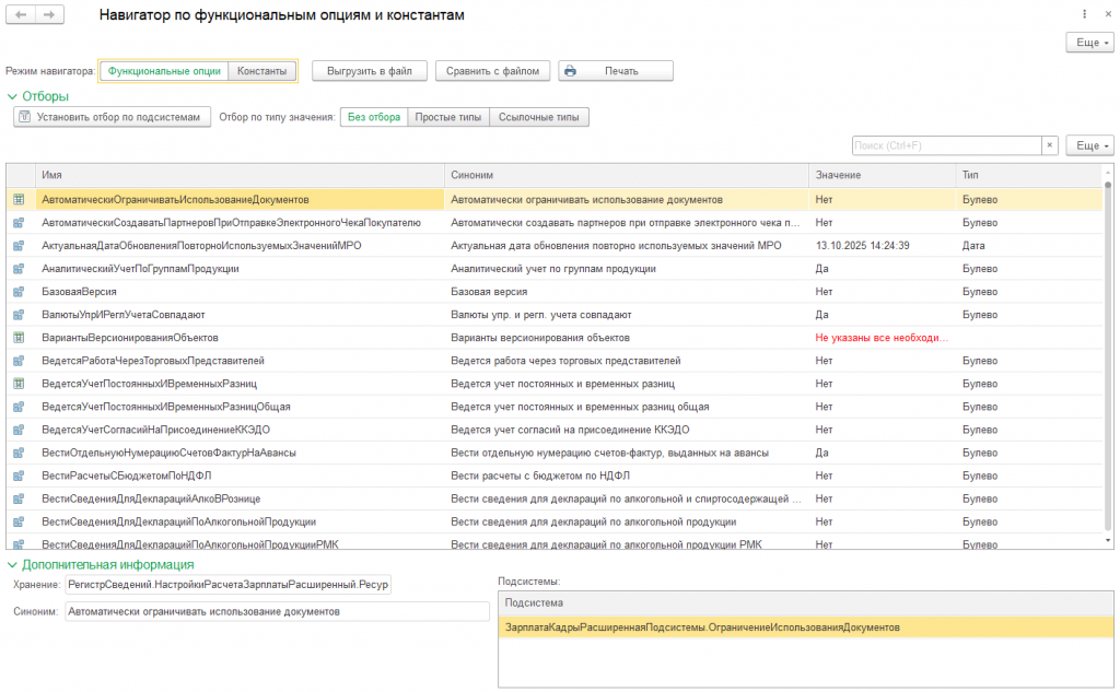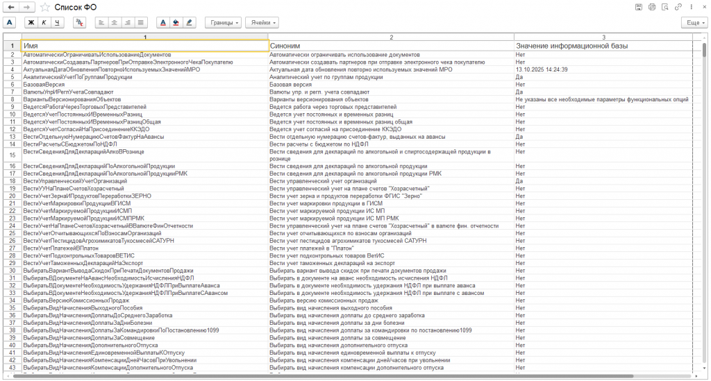 - выгрузка списка и последующее сравнение в другой базе, подсветка отличий в значениях