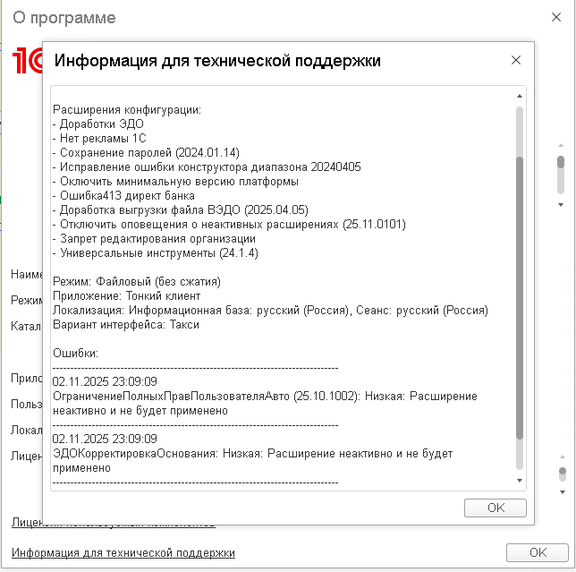 Вот как выглядят оповещения о неактивных расширениях при запуске 1С без расширения: