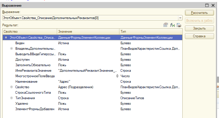 Для начала нам необходимо получить значение нашего дополнительного реквизита "АдресЗначение" для его передачи в адресный классификатор.