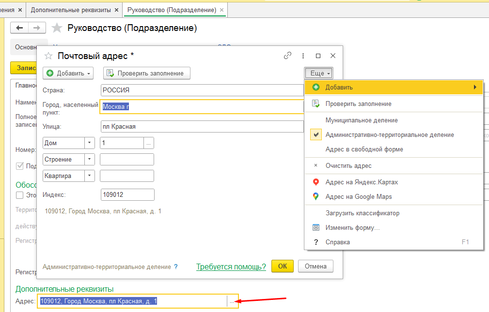 Сейчас при открытии Подразделения у нас есть доп. реквизит с кнопкой выбора, при нажатии на кнопку выбора открывается форма заполнения адреса. После заполнения, адрес переносится на наш доп. реквизит "Адрес", а благодаря доп. реквизиту "АдресЗначение" при следующем редактировании адреса, классификатор откроется в том же виде, что был при закрытии: