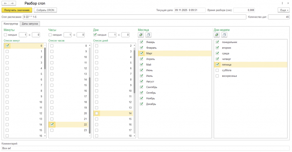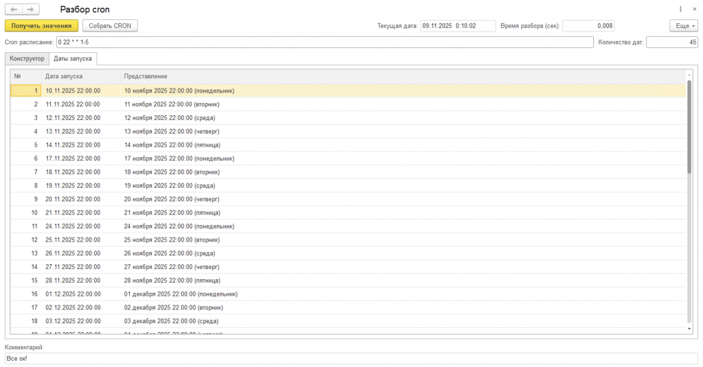 Для удобства можно использовать специальную обработку, которая помогает сформировать расписание в нужном формате с помощью визуального конструктора и сгенерировать даты запуска на основе заданных параметров.