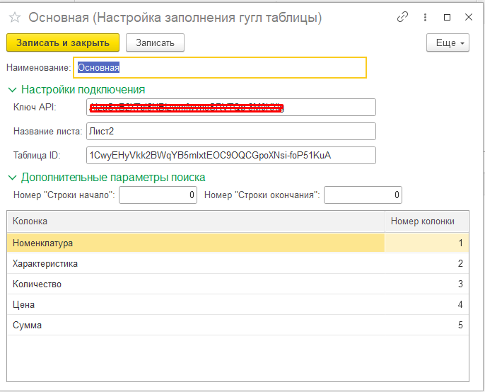 Для примера эта настройка сделана для загрузки данных из Гугл таблицы: