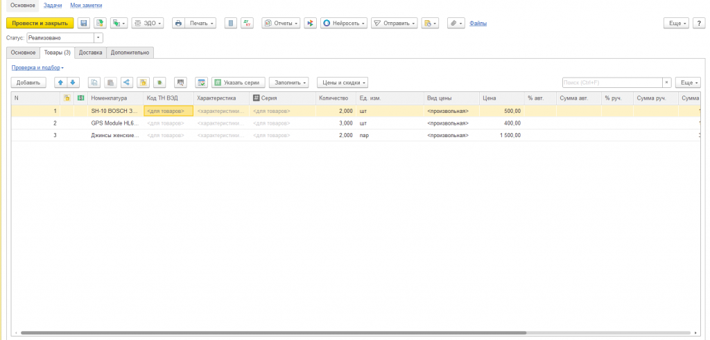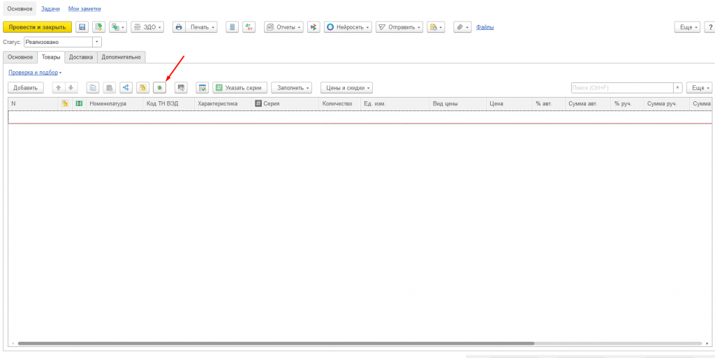 Для загрузки данных нажимаем кнопку "Перенести в документ", данные загрузятся в таблицу товаров.
