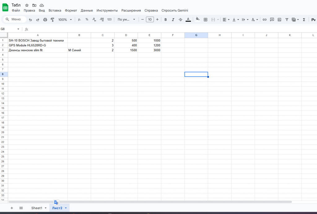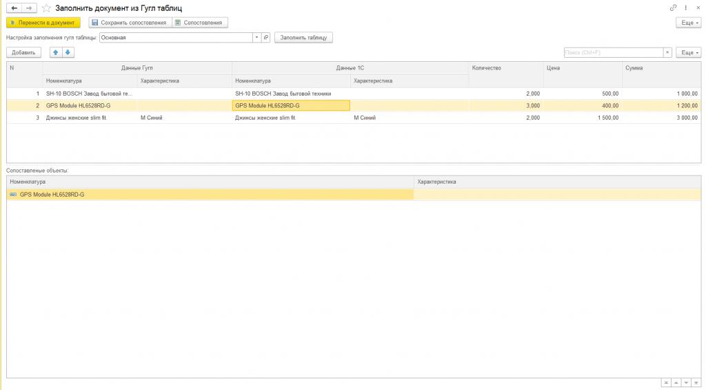 После выбора настройки нажимаем кнопку "Заполнить таблицу". Данные в таблицу товаров загрузятся из гугл таблицы. Поиск номенклатуры и характеристики осуществляется по наименованию.