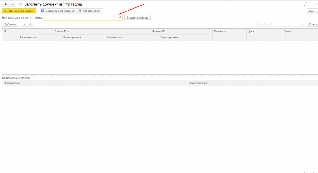 При нажатии на кнопку "Заполнить из Гугл таблицы" откроется обработка "Заполнить документ из Гугл таблиц". В поле "Настройка заполнения гугл таблиц" создаем или выбираем настройку.