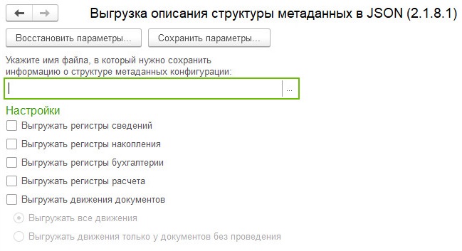 Внешняя обработка предназначена для формирования текстового описания структуры всех метаданных конфигурации 1С в формате JSON.