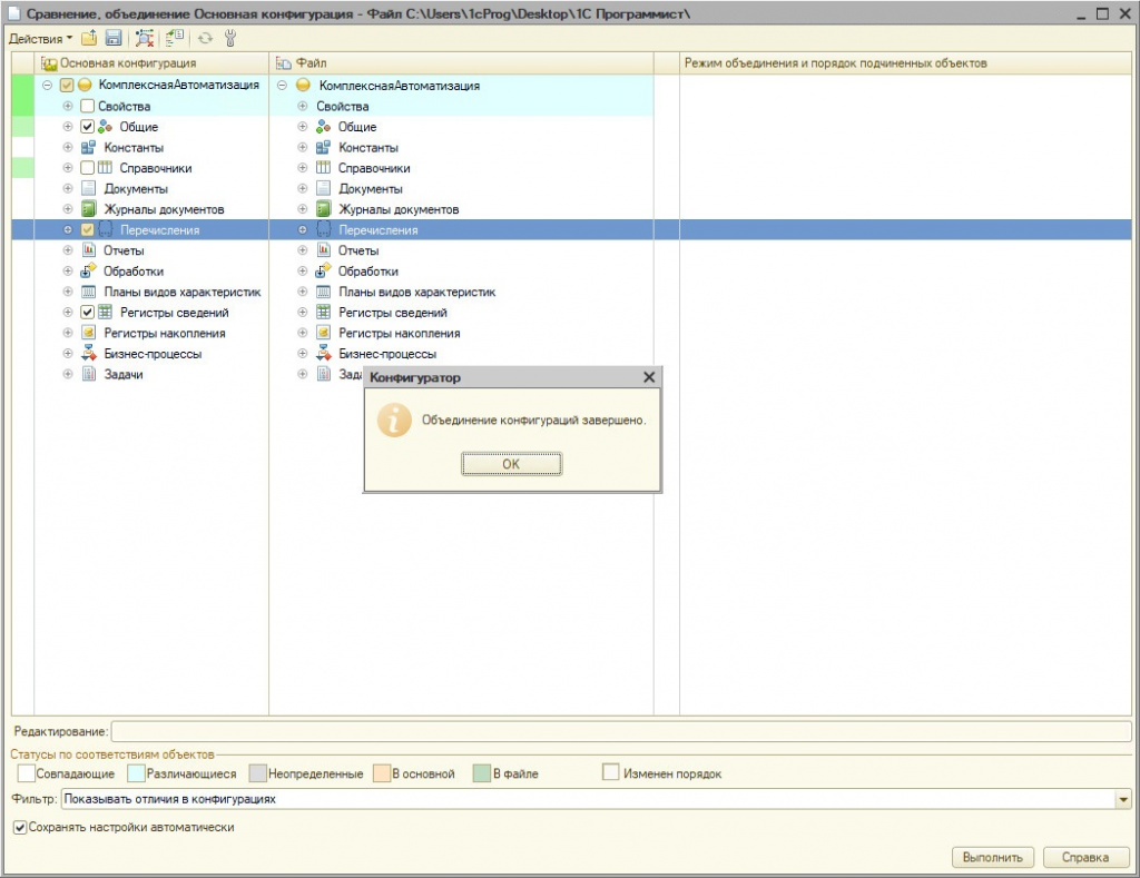 После этого нажимаем кнопку "Выполнить" в нижней правой части формы "Сравнение, объединение...".