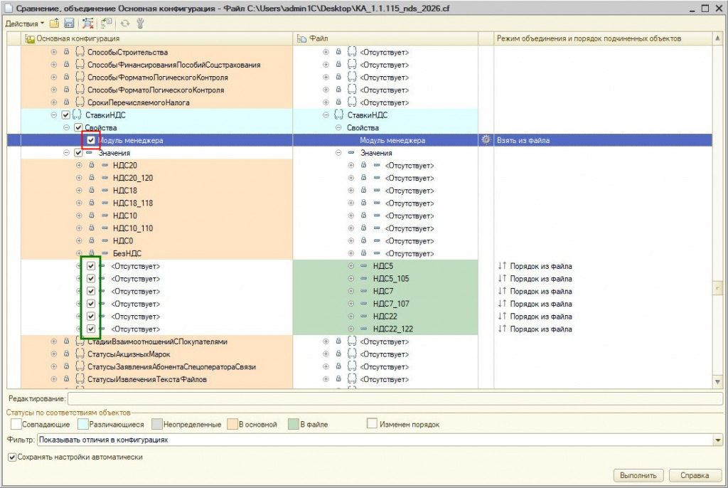 - Флажки значений: "НДС22", "НДС22_122" и "НДС5", ""НДС5"_105" и "НДС7", "НДС7_107", если они ранее не были установлены в базу.