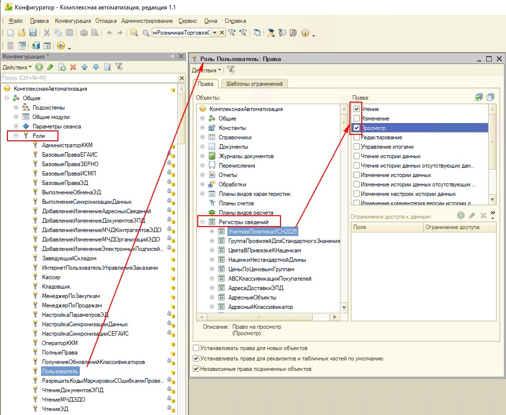 После сохранения изменений остается последнее, если в базе есть пользователи с неполнвми правами. Для роли "Пользователь" на вкладке "Права" для регистра сведений "УчетнаяПолитикаУСН2025" добавить "Права": "Чтение" и "Просмотр".