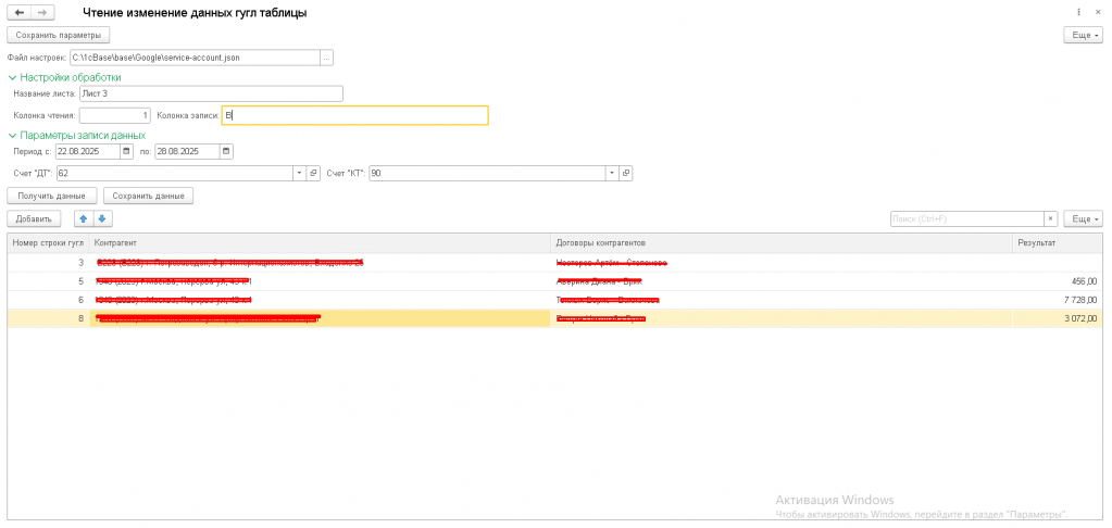 Обработка загрузит контрагентов и договора из гугл таблицы по указанной колонке в 1С таблицу и рассчитает сумму по выбранным счетам за выбранный период. Рассчитанные данные можно загрузить в гугл таблицу в указанную колонку. Обработку возможно использовать как шаблон для своих разработок.
