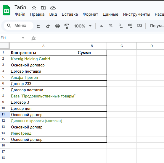 У нас есть таблица с контрагентами и договорами, нам нужно проставит обороты по счету в колонку "Сумма".