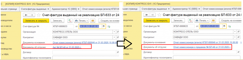 Запрос клиента: При создании счета-фактуры выданного на основании отчета агента о продажах автоматически формируются документы об отгрузке, но тип документа встает Акт, а нужен Отчет агента. Приходится в каждый заходить и руками исправлять. Причем, когда меняем на Отчет, то не выбираем конкретный, а только наименование документа из списка. Можно с этим что-нибудь сделать?