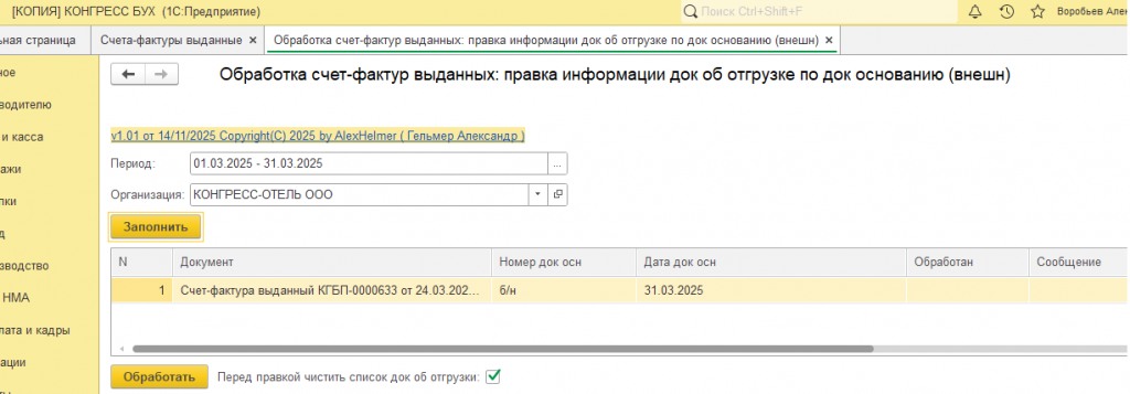 Обработка счетов-фактур выданных за период - правка информации о документе об отгрузке