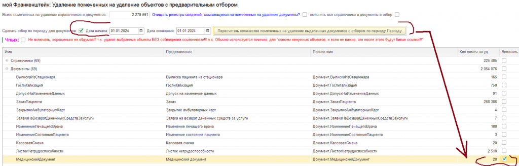 Например, отправлять на отработку сразу 300 тысяч документов - это долго и не рационально. Поэтому для документов я добавила фильтр по периоду. На скрине видно, что, выбрав один день и нажав кнопку пересчитать, в отборе будет не 300 тысяч, а всего 28 штук - такой объем быстро проанализируется.