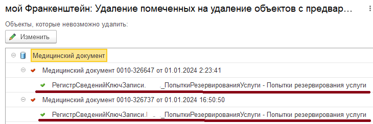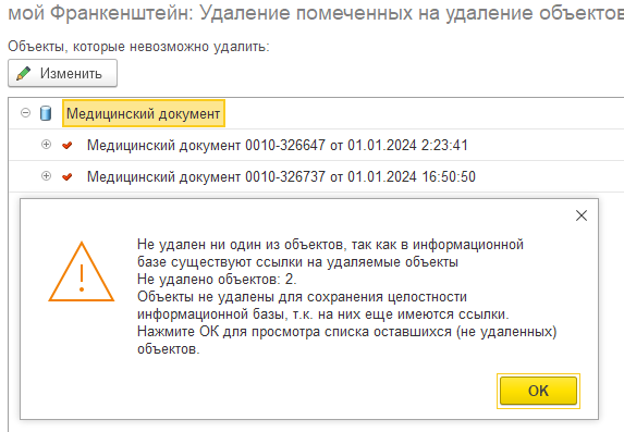 Так как для первого анализа - мы пытаемся удалить с ссылочным контролем связанных документов, поэтому получили предупреждение, что данные документы не могут быть окончательно удалены, так как на них есть записи в регистрах сведений: