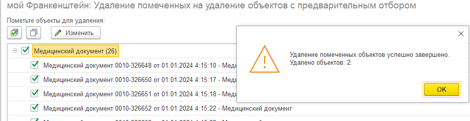 Получаем предупреждение, что все удалилось! В этом режиме, с включенной галкой "Очищать рег.свед", идет поиск ссылок на объект в базе, если найденные связанные объекты - это регистры сведений, то моим универсальным запросом к полученному регистру сведений - удаляется именно эта запись, а потом и сам документ (или справочник, в некоторых конфигурациях - и такие чудеса есть: как запись элемента справочника в регистре сведений)).