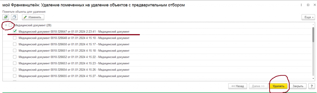 На следующей странице формы появится список из наших отобранных 28 штук документов. Чтобы провести первый анализ по данным удаляемым объектам - нам так же не нужно выбирать все, отмечу галочкой только парочку документов.