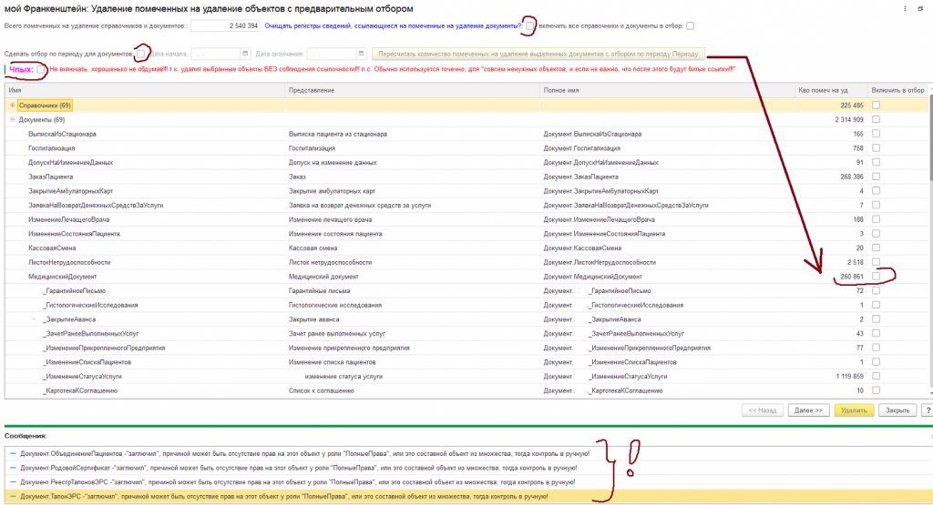 Так как для первого анализа - мы пытаемся удалить с ссылочным контролем связанных документов, поэтому получили предупреждение, что данные документы не могут быть окончательно удалены, так как на них есть записи в регистрах сведений: